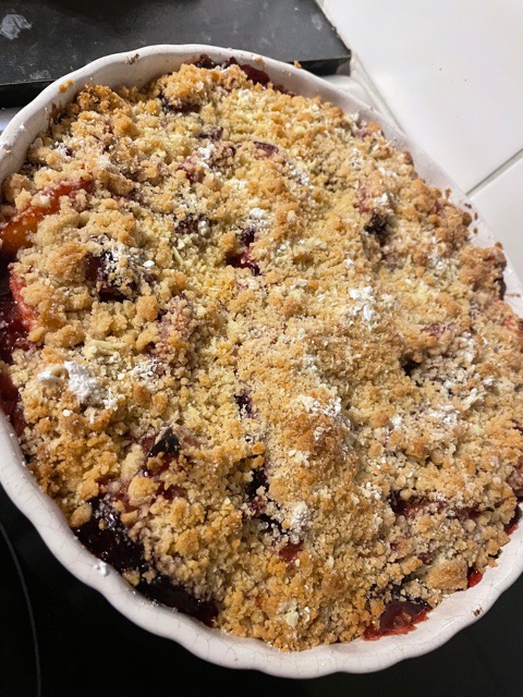 Place one part of crumbles into pie pan. bake it for 5 min then take it out of the oven and put the plums on it and cover the plums with the rest of the crumble and put it back in the oven for 25mins.